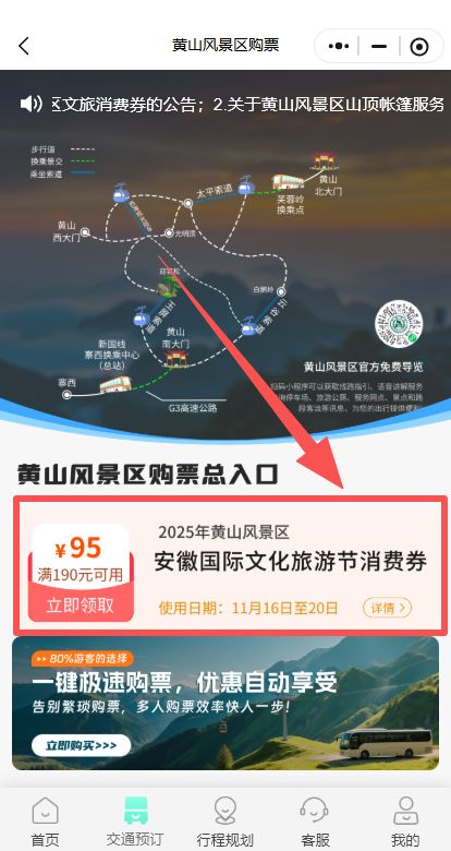 【导语】:2025年11月11日10:00起,在“黄山旅游官方平台”小程序发放安徽国际文化旅游节消费券,仅供在本小程序内预约并购买黄山风景区门票抵扣。